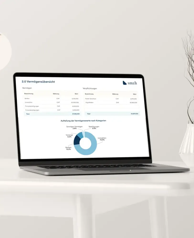 Die smzh Gesamtvermögensanalyse betrachtet nicht nur Wertschriften, sondern das gesamte Vermögen – inklusive Vorsorgegelder, Immobilien, Beteiligungen und Verbindlichkeiten.
